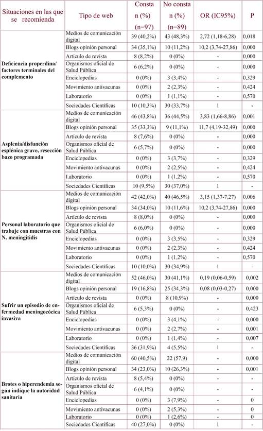 Results.: In total, 186 web links were analyzed. Adhered recommendations were found in a range of links, from 52.2% (97/186) with an indication for people with properdin deficiency/terminal component pathway deficiency, to 79.6% for outbreak situations. Vaccinating children from two months of age was a recommendation not issued by the Ministry that was found in 72.6% of the links. For each of the Ministry recommendations, official public health institutions always provide information adhering to them. Digital media provided information about vaccination adhering to official guidelines with a significantly higher frequency than scientific societies in cases of people with properdin deficiency/terminal component pathway deficiency (OR: 2.72; 95%CI: 1.18-6.28) and asplenia (OR: 3.83; 95%CI: 1.66-8.86).