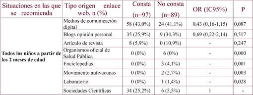 Según el tipo de origen, los enlaces web de los organismos oficiales de salud pública siempre proporcionaron información adherida para cada una de las recomendaciones de vacunación consideradas por el MSSSI (tabla 1). Por contra, los enlaces de enciclopedias, movimiento antivacunas y laboratorios, no proporcionaron ninguna información sobre recomendaciones de vacunación frente al meningococo B, llegando a especificarse, en el caso de los movimientos antivacunas, que “ni la AEMPS ni el Grupo de Trabajo Registro de Vacunas han aceptado la utilización de la vacuna en España”.