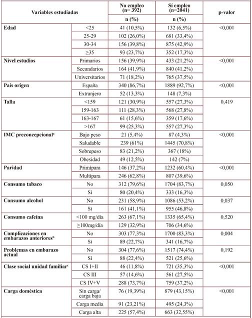 Las características de las mujeres en función de su situación laboral se presentan en la tabla 1. Las mujeres empleadas tenían 30,7 años de media, y en su mayoría tenían estudios secundarios o universitarios (79%), eran primíparas (60%), sin complicaciones en embarazos anteriores (83%) y de nivel socioeconómico alto (35% clase social I+II). Las mujeres no trabajadoras tenían una edad media de 30,6 años, con estudios primarios o secundaria (82%), multíparas (63%), con más problemas en embarazos anteriores (23%) y de clase social baja (74% clase social IV+V).