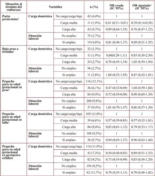 Resultados: Las mujeres con carga doméstica media tenían menos riesgo que el resto de mujeres de PPT (OR=0,41; IC95%:0,21-0,81), PEG en peso (OR=0,47; IC95%:0,32-0,69), talla (OR=0,57; IC95%:0,39-0,83) y perímetro cefálico (OR=0,58; IC95%:0,40-0,83); las mujeres con carga doméstica elevada también reducían su riesgo de PEG en peso: (OR=0,72; IC95%:0,54-0,98) y perímetro cefálico (OR=0,73; IC95%:0,54-0,99). Al analizar conjuntamente la situación laboral y la carga doméstica, las mujeres con carga doméstica media tenían menos riesgo de PPT (OR=0,29; IC95%:0,14-0,58) que las mujeres sin carga doméstica o con carga elevada.