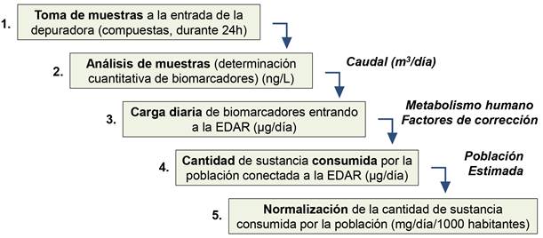 WBE parte de la base de que los productos de excreción del metabolismo humano (biomarcadores) resultantes del consumo de drogas son vertidos a los sistemas de alcantarillado urbanos. Por lo tanto, su determinación en las aguas residuales proporciona información sobre la cantidad y tipo de drogas consumidas en una ciudad. Para aquellos productos de excreción que son estables en agua residual y que, por tanto, llegan prácticamente intactos a la estación depuradora de aguas residuales (EDAR), es razonable asumir que la cantidad excretada de forma colectiva se vea reflejada por la carga total recibida en la EDAR en un determinado intervalo de tiempo. La recogida de muestras representativas para dicho intervalo temporal es, en consecuencia, uno de los factores clave en este enfoque.