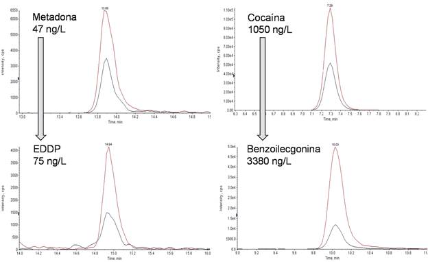 La composición de las aguas residuales es muy compleja e incluye concentraciones relativamente elevadas de sustancias interferentes en la determinación de los biomarcadores de interés, los cuales están presentes a niveles muy bajos de concentración (generalmente (sub)-µg/L). Para llevar a cabo los análisis, en primer lugar se ha de filtrar (o centrifugar) el agua para eliminar los sólidos en suspensión. Posteriormente, se requiere una etapa de pre-concentración de los biomarcadores, realizada normalmente mediante extracción en fase sólida, en la que se eliminan a su vez algunas de las sustancias potencialmente interferentes en el análisis. El extracto obtenido en este proceso se analiza generalmente mediante cromatografía líquida acoplada a espectrometría de masas en tándem (LC-MS/MS), técnica analítica muy sensible y selectiva con la que se pueden determinar concentraciones a nivel de traza con una alta fiabilidad. A modo de ejemplo, la figura 2 muestra los cromatogramas obtenidos con este tipo de análisis para la metadona, cocaína, y sus principales metabolitos (utilizados como biomarcadores), estos últimos presentes en agua residual a mayores concentraciones que las sustancias activas originales9.