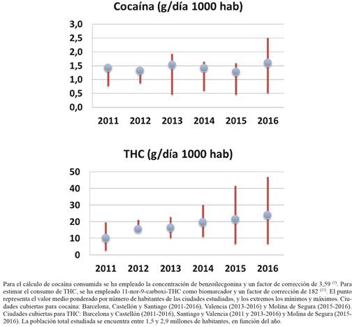 A modo de ejemplo, la figura 3, resume los estudios realizados en España a través de la red SCORE en colaboración con el EMCDDA para el cannabis y la cocaína, las dos drogas ilegales más consumidas en España, en el período 2011-2016. Los estudios se basaron en muestreos realizados durante una semana en los meses de Marzo-Abril, evitando festividades especiales, de manera que representan una semana típica. Los datos de consumo obtenidos en las ciudades monitorizadas anualmente se resumen en la leyenda de la figura 3 y se detallan en las webs del EMCDDA12 y de la red SCORE11. Existen otros estudios, por ejemplo en Talavera de la Reina19 o Tarragona20, pero no se han incluido en este extracto al no haberse realizado en el mismo marco temporal.