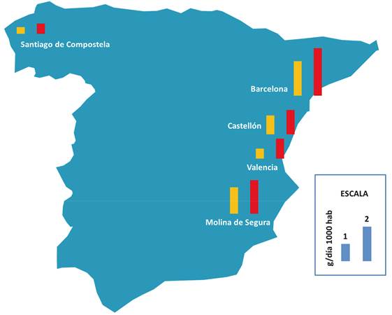A nivel español5,6,11, los datos obtenidos a lo largo de siete años de colaboración en ciudades como Castellón, Valencia, Barcelona o Santiago de Compostela reflejan un consumo de cannabis y cocaína superior al de otras drogas como metanfetamina o éxtasis (MDMA), sobre la base de estudios realizados a lo largo de una o dos semanas completas. Este consumo se encuentra a un nivel medio-alto comparado con el de otras ciudades europeas, aunque es inferior al de ciudades neerlandesas como Ámsterdam, Utrecht o Eindhoven, o al de ciudades belgas como Amberes. En los países nórdicos, por el contrario, los resultados sugieren un consumo bajo de cocaína, y muy elevado de metanfetamina. De hecho, el mayor consumo de esta droga se detectó en ciudades como Oslo (Noruega), Helsinki y Turku (Finlandia), y Budweis (República Checa). Por lo que respecta al MDMA, el consumo más alto se registró en las ciudades neerlandesas.