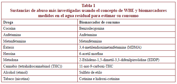Hasta la fecha, WBE se ha aplicado principalmente a la investigación de sustancias de abuso, tanto ilegales (cocaína, cannabis, compuestos de tipo anfetamínico, incluyendo éxtasis, y opioides), como, en menor medida, legales (alcohol13,14,15 y tabaco16). Los numerosos estudios realizados han validado el uso de esta herramienta para estimar el consumo de estas sustancias a nivel local, y para detectar cambios relevantes en el consumo de drogas en entornos especiales (ej. eventos deportivos y festivales de música). En este sentido, en España se pueden destacar un estudio realizado durante las Fallas en Valencia con el fin de cuantificar el efecto de esta celebración en el consumo de alcohol y sustancias ilícitas13, uno realizado en Castellón durante un evento musical internacional17, y un estudio llevado a cabo en un centro penitenciario de Cataluña para investigar el consumo de drogas dentro del mismo18.
