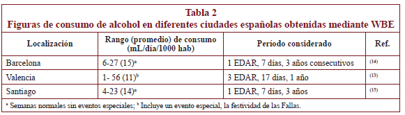 Aunque el campo de aplicación más desarrollado de WBE es la estimación del consumo de drogas, esta aproximación también permite obtener información sobre los hábitos de consumo de otras sustancias y, en general, sobre el estilo de vida de una población utilizando los biomarcadores adecuados, como ya se ha hecho para evaluar el perfil de consumo de cafeína21 en varias ciudades europeas o de alcohol22. En este sentido, la tabla 2 resume los resultados obtenidos a nivel nacional para el consumo de alcohol mediante WBE. Además, potencialmente, WBE también podría proporcionar información sobre la dieta, el estado de salud de una población, o su nivel de exposición a contaminantes ambientales, ya que el agua residual urbana se puede considerar como un medio de diagnóstico de una ciudad. En esta dirección, se han desarrollado varios estudios dirigidos a la aplicación de este concepto para evaluar la exposición a ftalatos (empleados como plastificantes)23, pesticidas24, o la identificación y el análisis de biomarcadores válidos para evaluar el estrés oxidativo de una comunidad25 o de biomarcadores asociados con procesos carcinogénicos26.
