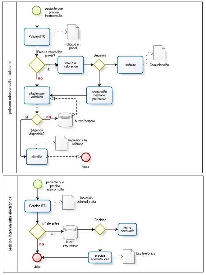 En el análisis inicial se detectó que cuando el médico cursaba la petición como preferente, la solicitud tardaba en torno a cuatro días en estar disponible para su valoración por parte del servicio, y hasta seis días más tarde dicha solicitud no regresaba al servicio de admisión. La petición de ITC se introducía en el sistema informático y se citaba si había disponibilidad en las agendas genéricas del Servicio. Si no había, la solicitud quedaba pendiente de cita e incluso pendiente de registro cuando existía una demora notable, escapando entonces al control de gestión.