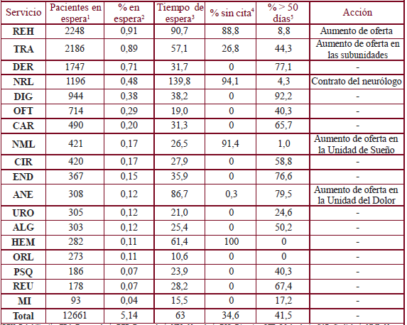 Con este flujo de trabajo, la situación de partida a final del 2015 mostraba 12.661 pacientes registrados en espera en nuestras consultas, el 5,14% de la población de referencia, con un intervalo de confianza del 95%(IC95%) de 4,66-5,52%, de los cuales el 34,6% (IC95%= 33,8-35,4%) no tenían cita asignada y el 41,5% (IC95%= 40,7-42,3%) tenían una espera superior a 50 días. El tiempo medio de espera para la primera consulta era de 63 días con una desviación típica (DT) de 32,17. La situación de la lista de espera por Servicios en nuestra Área de Salud se detalla en la tabla 1.