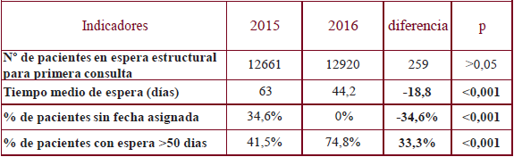 En diciembre de 2016 se contaba con 12.920 pacientes en espera para primera consulta, todos con cita asignada (5,17% de la población, IC95% =4,69-5,55%). El 74.8% (IC95%= 74,1-75,5%) tenían una espera superior a 50 días. El tiempo medio de espera para la primera consulta había bajado a 44,2 días (DT=16,5), 18,8 días de media menos que el año anterior (tabla 3).