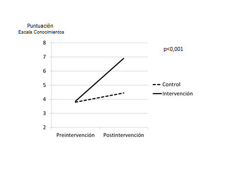 Cuestionario pre-intervención. Comprobamos que antes de la intervención no hubo diferencias significativas en la puntuación total de la escala de conocimientos, que fue baja en ambos grupos. Sobre una escala de 8 puntos, la puntuación media en el GE fue de 3,9 puntos (DE:1,5) y en el GC 3,8 puntos (DE:1,5).