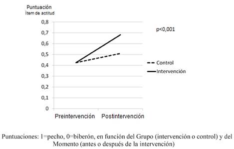 En cuanto a las actitudes hacia la LM, no existían diferencias significativas entre ambos grupos en el cuestionario pre-intervención. El 63,1% de adolescentes creían que dar de mamar estropea el pecho y el 57% del total de adolescentes encuestados consideraban más fácil dar biberón que dar el pecho. La tabla 3 recoge el porcentaje de actitudes positivas hacia la lactancia en los tres ítems incluidos en el estudio, en ambos grupos.
