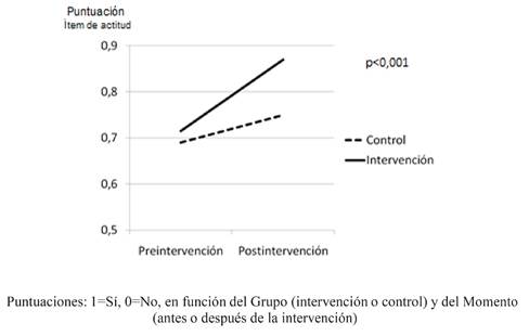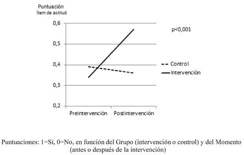 Después de la intervención se comprobó que el porcentaje de respuestas correctas en los ítems de conocimientos y en los de actitudes habían aumentado de forma significativa en el GE (tablas 2, 3).