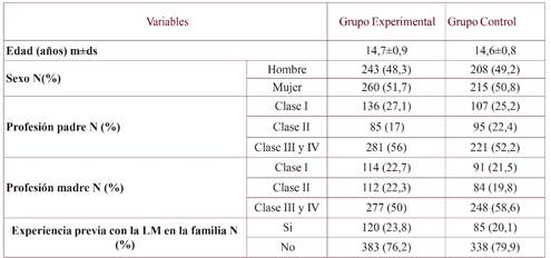 Las variables controladas fueron: El sexo, el curso escolar, la profesión de los padres, el tipo de colegio y la experiencia previa con la LM a nivel familiar.