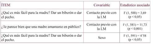 Una vez establecido el efecto global de la intervención, se realizaron análisis de covarianza para evaluar si otras variables recogidas en el estudio (curso escolar, sexo, tipo de colegio, contacto previo con la lactancia materna y profesión de los padres) podrían estar modulando este efecto. De ella solo las variables “Contacto previo con la LM” y “Sexo” demostraron tener un efecto significativo en los ítems de actitudes. Los adolescentes que tenían experiencia previa con la LM a nivel familiar mostraban mejores actitudes hacia el hecho de amamantar en público o considerar fácil dar el pecho. Por otro lado, entre las mujeres existía una mayor preocupación por la posibilidad de que la lactancia materna estropee el pecho, que entre los varones (tabla 4). Comprobamos asimismo que los efectos de la intervención sobre las actitudes de los participantes se mantenían una vez descontada la influencia de dichas covariables. Estas variables no tuvieron un efecto significativo en la escala de conocimientos sobre LM.