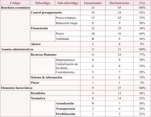 Todos los encuestados afirmaron que los CRC permiten mejorar la gestión económica y administrativa del hospital. Dentro del código «Beneficios económicos» los encuestados destacaron el control presupuestario, la obtención de financiación y la posibilidad de ahorro como ventajas de la firma de CRC, apareciendo, por tanto, como subcódigos de este apartado: «Control presupuestario», «Financiación» y «Ahorro».