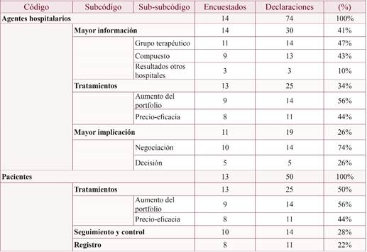 Implicaciones para la salud. La tabla 3 muestra los códigos, subcódigos, sub-subcódigos y frecuencias de la categoría IS “Implicaciones para la salud”. Se detectó un total de 124 declaraciones que se dividieron en dos códigos: «Agentes hospitalarios» y «Pacientes». Dentro del código «Agentes hospitalarios» se definieron tres subcódigos: «Mayor información», «Tratamientos» y «Mayor implicación». En el subcódigo «Mayor información» se registraron declaraciones que hacían referencia al aumento en la información que los profesionales médicos reciben de las compañías farmacéuticas en relación con el grupo terapéutico del fármaco «Grupo terapéutico» y los compuestos de los fármacos «Compuesto».