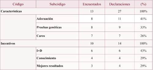 En resumen, para cada categoría se fijó una serie de códigos. Cada código agrupó declaraciones registradas que hacían referencia a la misma categoría. Los códigos a su vez se dividieron en subcódigos. Finalmente, se efectuó un análisis descriptivo con las cuantificaciones de las frecuencias de cada código según el discurso de los encuestados.