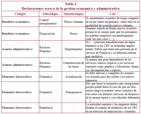La tabla 2 muestra una selección representativa de las declaraciones acerca de la categoría GEA junto al código, subcódigo y sub-subcódigo con el que están relacionadas. Se indica cómo los profesionales médicos estimaron que la firma de CRC permitía obtener efectos positivos en cuanto a beneficios económicos, facilidades administrativas y actualización en la normativa.