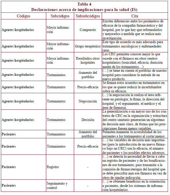 En cuanto al subcódigo «Tratamientos», se incluyó tanto en el código «Agentes hospitalarios» y «Pacientes» debido a que los encuestados los consideraron igualmente relevantes para ambos casos. Los CRC tuvieron implicaciones positivas para la salud para trece de los catorce encuestados, por dos razones: la primera es que aumentaban el portfolio de tratamientos disponibles en el hospital (sub-subcódigo «Aumento del portfolio»), y la segunda, que los tratamientos que fueron introducidos en el hospital con un CRC contaban con una mayor eficacia (sub-subcódigo «Precio-eficacia»).