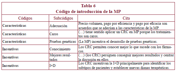 Del mismo modo, se creó el código «Incentivos» para captar los incentivos que aporta la MP a la implementación de los CRC; entre ellos destacaron: el impulso de la investigación y el desarrollo dentro del hospital, un aumento en el conocimiento (grupo terapéutico) que obtienen los profesionales médicos y la obtención de mejores resultados (sanitarios y económicos). La tabla 6 recoge las citas que ilustran las declaraciones relacionas con la introducción de la MP bajo acuerdos de riesgo compartido.