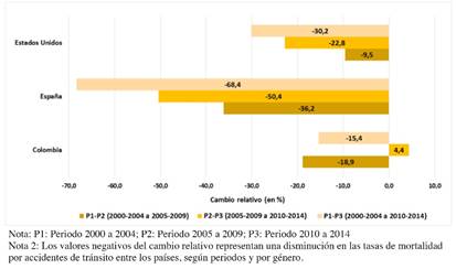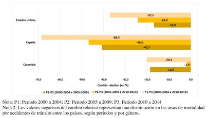 Conclusions: Colombia presented a less favorable evolution of mortality due to AT than Spain and the US. Men aged 15 to 44, motorcyclists and cyclists were the most committed. The TAs are a public health problem that Colombia has raised and must adapt to its reality those successful measures in other countries.