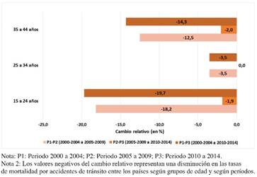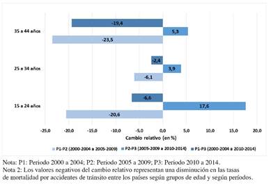 Methods: A descriptive cross-sectional study was carried out for five-year periods, by calculating the AMRs by the direct method of standardization according to sex and age groups, as well as the adjustment of the motorization index. The mean values, the 95% confidence interval for each country and the relative change between the periods studied were calculated.