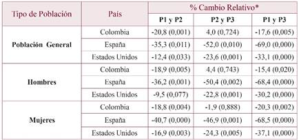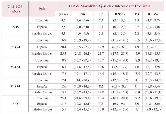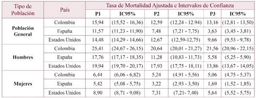 Se observó que entre los períodos P1-P2 en los tres países las tasas ajustadas de Mortalidad (TAM) disminuyeron significativamente: en un 20,8% en Colombia, en un 35,3% en España y en un 12,4% en EEUU (p=0,001; p=0,011; p=0,033 respectivamente) (tablas 1 y 2, figura 1); de igual manera la disminución fue significativa en los tres países cuando se compararon globalmente los períodos P1-P3 (p<0,05). Sin embargo, en el período P2-P3, Colombia experimentó un incremento de su TAM en un 4%, que contrastó con la reducción del 52% que experimentó España y del 23,6% que experimentó EEUU en este mismo período (figura 1).