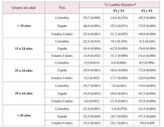 Cuando se compararon por género los grupos etarios se obtuvieron resultados bastante distintos para los hombres y las mujeres y según el grupo de edad. Tanto en España como en EEUU se evidenció una reducción de la TAM en todos los grupos de ambos sexos en todos los periodos. En Colombia en cambio, en los hombres con edades de 15 a 24 años, de 25 a 34 años y de 25 a 34 años destacó un marcado incremento en el período P2-P3 (tabla 5, figura 3a), del 18,3%, 6,8% y del 7,6%, respectivamente. En las mujeres, los mismos grupos de edad de Colombia no experimentaron estos incrementos sino que presentaron una reducción o estabilización de sus TAM (tabla 4, figura 3b).