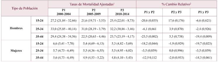Las TAM disminuyeron significativamente en los tres países y en todos los grupos etarios en los períodos P1-P2 (p<0,05), excepto en el grupo de 25 a 34 años en Colombia, que solo disminuyó en un 5,9% y pasó de 18,8 a 17,7 por 100.000 (p=0,654), y en EEUU, que disminuyó en un 5,2% (de 17,3 a 16,4; p=0,452) (tablas 3 y 4). Entre los períodos P1-P3 hubo disminución de las TAM en todos los países y en todos los grupos etarios con diferencias significativas (p=0,005), excepto en el grupo de 15 a 24 años para Colombia, que disminuyó solo en un 8,3%, pasó de 16,9 a 15,5 por 100.000 (p=0,420) y en el grupo de 25 a 34 años de edad en donde se incrementó la TAM en un 0,5%, pasó de 18,8 a 18,9 (p=0,996). Esta menor reducción de la mortalidad en Colombia se debió a que en el período P2-P3 se produjo un incremento de la TAM en ambos grupos de edad, fue del 18,3% en el de 15 a 24 años y del 6,8% en el de 25 a 34 años (figuras 2a y 2b).