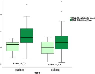 Se realizó un análisis bivariante mediante técnicas estadísticas clásicas, comparando por la variable sexo, relacionando las medias de las variables cuantitativas mediante la prueba T de Student cuando seguían una distribución normal y en caso contrario la prueba de U-Mann-Whitney. La comparación de edad cronológica y edad vascular se realizó mediante un T-Test para muestras relacionadas.