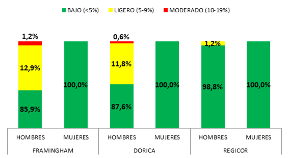 En la población estudiada las mujeres presentan más factores de riesgo cardiovascular que los hombres, pero a pesar de ello, cuando se evalúa el porcentaje de riesgo categorizado con los distintos modelos analizados (Framingham, REGICOR y DORICA) el total de las mujeres están catalogadas por presentar un riesgo definido como bajo.