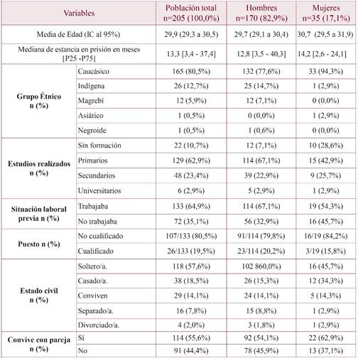 A fecha 15 de septiembre de 2017 la cohorte final estuvo constituida por 205 personas (97,2% del total de población seleccionable), tras producirse 6 pérdidas: 1 por negativa, 1 por defunción y 4 pérdidas por traslado o excarcelación. Con una media de edad de 29,9 años (IC 95%: 29,3 a 30,5), superior en las mujeres 30,7 (IC 95%: 29,5 a 31,9) con respecto a los hombres 29,7 (IC 95%: 29,1 a 30,4), aunque sin diferencias estadísticamente significativas. La mediana de estancia ininterrumpida en prisión fue de 13,3 meses IQR (3,6-37,4). El resto de características socio-demográficas aparecen en tabla 1.