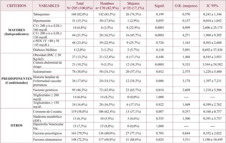 El análisis de los factores de riesgo queda reflejado en tabla 3. Como principal factor de riesgo, entre los criterios mayores estuvo el tabaquismo, con una prevalencia del 82,0%, mayor entre los hombres 83,5% que en las mujeres con un 74,3%, aunque el consumo en paquetes/año fue superior entre las mujeres 9,8 paquetes/año (IC 95%: 7,2 a 12,5) frente a 7,6 (IC 95%: 6,8 a 8,5) de los hombres con diferencias significativas (p=0,035). El riesgo de presentar hipercolesterolemia fue 4,271 (IC 95%: 1,960 a 9,305) veces mayor entre las mujeres, así como de presentar un perímetro abdominal de riesgo de 9,333 (IC 95%: 3,544 a 24,582) veces más que los hombres, o la presencia de antecedentes de enfermedad vascular precoz entre familiares de primer grado 3,174 (IC 95%: 1,397 a 7,211), presentar factores genéticos 2,609 (1,218 a 5,586), sedentarismo 2,575 (IC 95%: 1,228 a 5,400) o alimentarios 3,511 (IC 95%: 1,180 a 10,449). El consumo de cocaína fue mayor entre los hombres (62,4% frente a 37,1%; p=0,007).