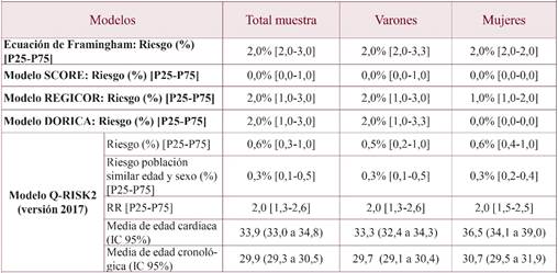 Para el cálculo de los distintos modelos de evaluación de riesgo cardiovascular, se utilizaron las calculadoras disponibles en Internet: CIRCE10 y Q-RISK11. Esta última, nos permite también determinar la edad vascular del sujeto.