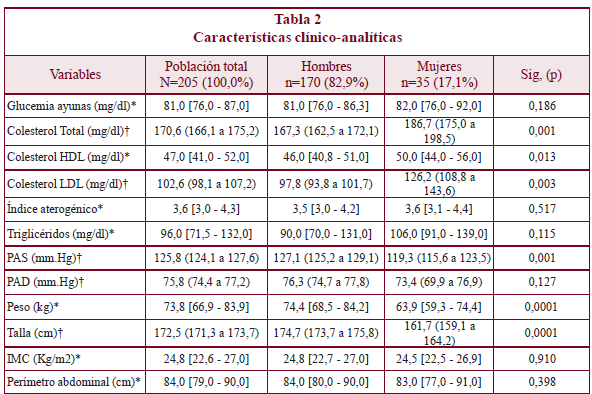 Entre las principales características clínico-analíticas, existen diferencias por sexo en cuanto a las cifras de colesterol total, colesterol HDL, colesterol LDL, presión arterial sistólica y medidas antropométricas (tabla 2).