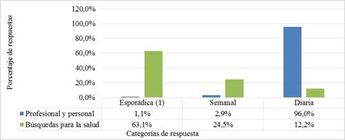 Frecuencia de acceso a Internet general y en búsquedas para la salud. En esta pregunta se obtuvieron 970 respuestas, que tras su revisión y categorización ofrecieron unos resultados que reflejaron que este era un grupo con experiencia en el uso de Internet. En la pregunta sobre el grado de utilización de Internet en consultas para la salud, con 968 respuestas, fue del 99,8%, sumando las distintas frecuencias de consulta. Una comparativa entre la frecuencia de consulta de Internet con fines de temática general personal o profesional, con la realizada sobre información y/o educación para la Salud encontradas, así como la frecuencia quedan reflejadas en la figura 1.