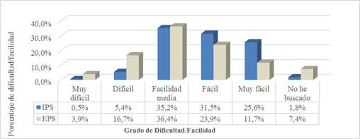 Grado de dificultad en las búsquedas para la salud y descripción de estas. El grado de dificultad encontrado en las búsquedas, fue preguntado por separado para Información para la salud (IPS) y para Educación para la salud (EPS). Se encontraron 965 respuestas válidas para la primera y 922 respuestas para la segunda (figura 2). Las respuestas indicaron en la primera pregunta una mayor facilidad que en la segunda para encontrar resultados.