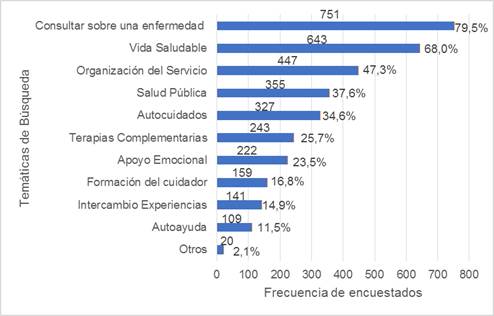 En relación con las temáticas de búsqueda, los resultados obtenidos en esta investigación son comparables con diversos estudios14,18,19,20,43,44. La temática más buscada es con motivo de etapas vitales, enfermedades, síndromes, pruebas, propias o de allegados y con frecuencia algo menor, sobre vida saludable, le siguen con menor interés las consultas de tipo administrativo sobre el servicio de salud que les prestan, seguidas de las de prevención y autocuidados y, menos demandadas, las terapias complementarias.