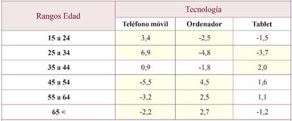 Encontramos que los usuarios de edades más jóvenes, rango de edad entre 16-24 años, se decantaron por el acceso a internet mediante teléfono móvil el 51,3%, mientras lo hacían por el ordenador un 48,7%, evolucionando las respuestas con la edad a una preponderancia del ordenador, así en el rango de edad de 45 a 54, el 15,1% utilizaba preferentemente el teléfono móvil frente al 76,3% que hacía por ordenador sus accesos a internet.