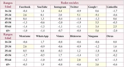 En cuanto a la influencia de la edad en la utilización de las redes sociales destacó la utilización de Facebook y YouTube, en todos los rangos de edad como redes principales, aunque la utilización desciende con la edad, así Facebook pasaba del 37,0% en el rango de edad de 25-34 años al 28,3% en el rango de 55-64 años. Para YouTube también descendía al incrementarse la edad pasando del 29,6% en el rango de 15-24, al 18,7% en el rango de 55-64 años. Instagram resultó utilizado principalmente por los más jóvenes 7,7% en el rango de 15-24 años pasando al 0,5% entre los 45 a 64 años, las respuestas de encuestados que no utilizaban Ninguna red social se incrementaron con la edad del 0,2% en el rango de 25-34 años, al 4,5 % para mayores de 65 años.