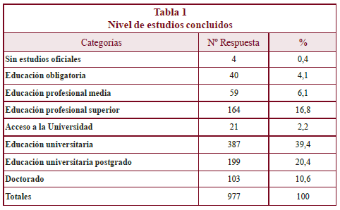 Nivel de estudios concluido. La pregunta ofreció como resultado (tabla 1) que la mayor concentración de encuestados era en Educación Universitaria, seguida de Educación universitaria postgrado y de Educación profesional superior. Tenían estudios universitarios de todos los niveles el 70,4% y, si considerábamos todos los que tenían estudios superiores, universitarios o no, eran el 89,4% de los encuestados, lo que también consideramos consecuencia de los ámbitos de distribución y definió al grupo como de nivel formativo medio-alto.