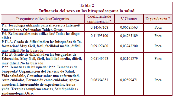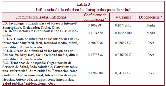 Se revisó la influencia de las categorías sexo y edad por separado, con los resultados obtenidos en las categorías incluidas en las preguntas sobre la Tecnología utilizada en las búsquedas, Redes sociales más utilizadas, Grado de dificultad encontrada en las búsquedas para la salud, tanto para información como para educación y Temáticas de búsqueda para la salud. Los resultados obtenidos pueden verse en las tablas 2 y 3.