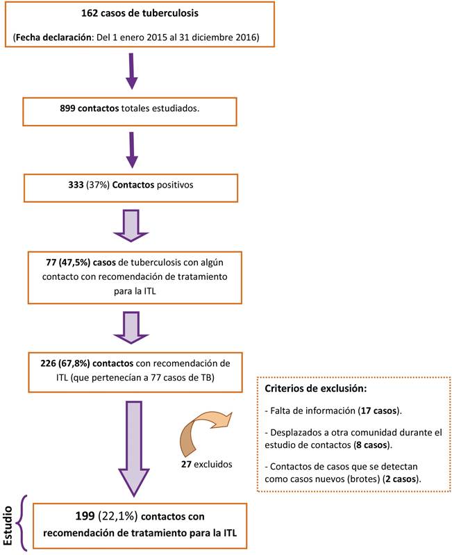 Se seleccionaron los 77 (47,5%) casos de TB que tenían contactos con recomendación de tratamiento para la ITL. Estos 77 casos, tenían asociados 226 contactos con recomendación de tratamiento preventivo, de los que quedaron excluidos 27 (17 por falta de información, 8 por desplazamiento a otra comunidad y 2 por ser casos de tuberculosis), entrando en el estudio 199 contactos (figura 1).