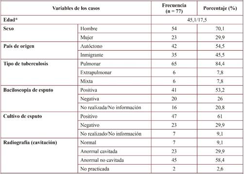 Los casos de TB (n=77) presentaron una media de edad de 45,1 años (DE: 17,5), siendo el 70,1% hombres. Respecto al país de origen, el 54,5% eran autóctonos, la mayoría presentaron localización pulmonar (84,4%). La baciloscopia de esputo y el cultivo de esputo resultaron ser positivos en el 53,2% y el 61% de los casos respectivamente, mientras que la radiografía de tórax anormal no cavitada representó el 58,4% (tabla 1).
