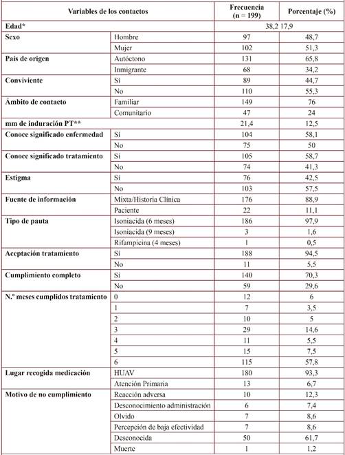 Se recogieron variables del caso índice y variables de los contactos. Del caso índice se estudió la edad, el sexo, el país de origen, el tipo de tuberculosis, la baciloscopia de esputo y la radiografía de tórax. De los contactos, se estudiaron las variables independientes: la edad, el sexo, el país de origen, la convivencia, el ámbito de contacto, los milímetros de la prueba de la tuberculina, los conocimientos sobre la ITL y el significado del tratamiento de la ITL, la existencia de estigma (“¿Piensa que puede afectar negativamente la Prueba de la Tuberculina positiva a sus relaciones familiares/sociales?”)2, la fuente de información, el tipo de pauta, el lugar de recogida de la medicación y el motivo de no cumplimiento. Las variables dependientes estudiadas fueron la aceptación del tratamiento de la ITL (“Aprobar, admitir o dar por buena la pauta de medicación al haber tomado como mínimo un comprimido de medicación”) y el cumplimiento (“Adherencia a la pauta completa de medicación. El cumplimiento del tratamiento de la ITL se basó en un número determinado de dosis a completarse en un plazo determinado de tiempo para cada régimen. Para el régimen de isoniazida diaria de 6 meses el cumplimiento de isoniazida diaria era 180 dosis dentro de 9 meses”)10,11.