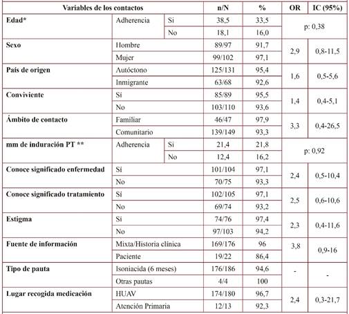 En el análisis bivariado la aceptación del tratamiento fue más frecuente en las mujeres (97,1%, OR= 2,9; IC 95%: 0,8-11,5), en los autóctonos (95,4%, OR= 1,6; IC 95%: 0,5-5,6), en los convivientes con el caso (95,5%, OR=1,4; IC 95%: 0,4-5,1), y cuando el ámbito de contacto era familiar (97,9%, OR=3,3; IC 95%: 0,4-26,5), en los que conocían el significado de la ITL (97,1%, OR= 2,4; IC 95%: 0,5-10,4), del tratamiento (97,1%, OR= 2,5; IC 95%: 0,6-10,6), y en los que presentaban estigma (97,4%, OR= 2,3; IC 95%: 0,4-11,6), aunque el estudio careció de potencia para establecer asociación estadística (tabla 3).