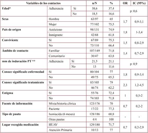 Resultados: El 69,1% de los casos de tuberculosis poseían estudio de contactos, y el 47,5% tenían algún contacto con prescripción de tratamiento preventivo. El 94,5% de los contactos aceptó el tratamiento de la ITL, y éste fue finalizado por el 70,3%. El cumplimiento fue más frecuente en los pacientes que conocían el significado del tratamiento de la ITL (ORa: 2,0; IC: 95% 1,0-4,1).