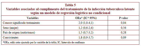 En el modelo de regresión logística multivariable el conocer el significado del tratamiento de la ITL se asoció de forma estadísticamente significativa con el cumplimiento (ORa = 2.0; IC 95%: 1,0-4,1) (tabla 5).