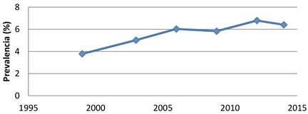 De los datos recientes, derivados de las mencionadas encuestas, obtuvimos una línea ascendente de la prevalencia (figura 1), aunque con una incipiente tendencia a la estabilidad. En la encuesta Europea de salud del 2009 descubrimos la primera reducción de la prevalencia; algo que se repitió claramente en la Encuesta Europea de Salud en España del 2014. Además el único incremento registrado después del 2006, recogido en la encuesta, supone un incremento de tan sólo un tercio del observado hasta esa fecha.