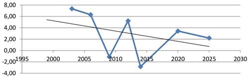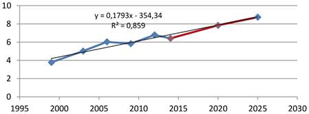 La calidad de la estimación lineal debe considerarse como buena, pues el coeficiente de determinación, que explica el porcentaje de varianza bien estimado por la recta, es del 85’9%. No obstante, la deficiencia que puede atribuírsele a esa proyección viene dada por la tendencia de las tasas de crecimiento medio interanual. Estas últimas, recogen un coeficiente de regresión negativo. Así, de valores próximos a 6% a principios del milenio, descienden a otros próximos al 2% de crecimiento medio anual (figura 3). Esto lleva a concluir que la regresión lineal puede no ser la proyección más acertada, al no estar considerando la tendencia decreciente de las tasas de crecimiento. El ajuste requiere de una inflexión en la curva proyectada. De hecho, la simple regresión polinómica de orden 2, mejora la explicación de la varianza sustancialmente, hasta alcanzar un valor del 94,2%.